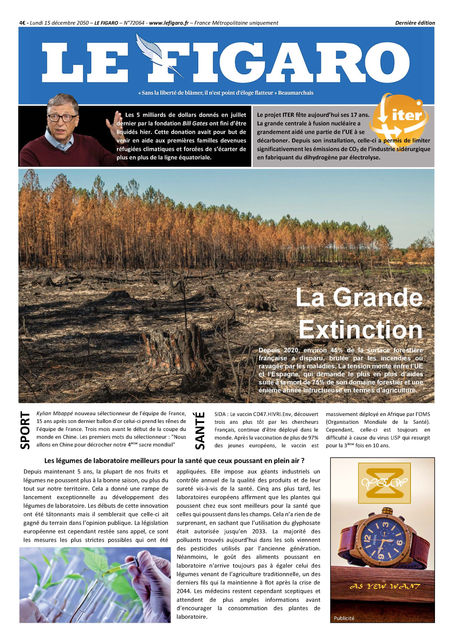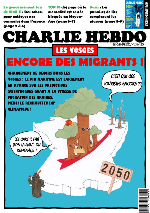 Ce travail de « unes » part d’une hypothèse invérifiable : la presse écrite existera encore, les titres régionaux ou nationaux seront toujours présents. Quelle sera la « une » aussi bien de Vosges Matin que de Charlie Hebdo ? Que seront les grands titres de 2050 ? Nous ne nous sommes autorisé aucune censure, juste un conseil : « soyez impertinents, mais toujours perti-nents ».